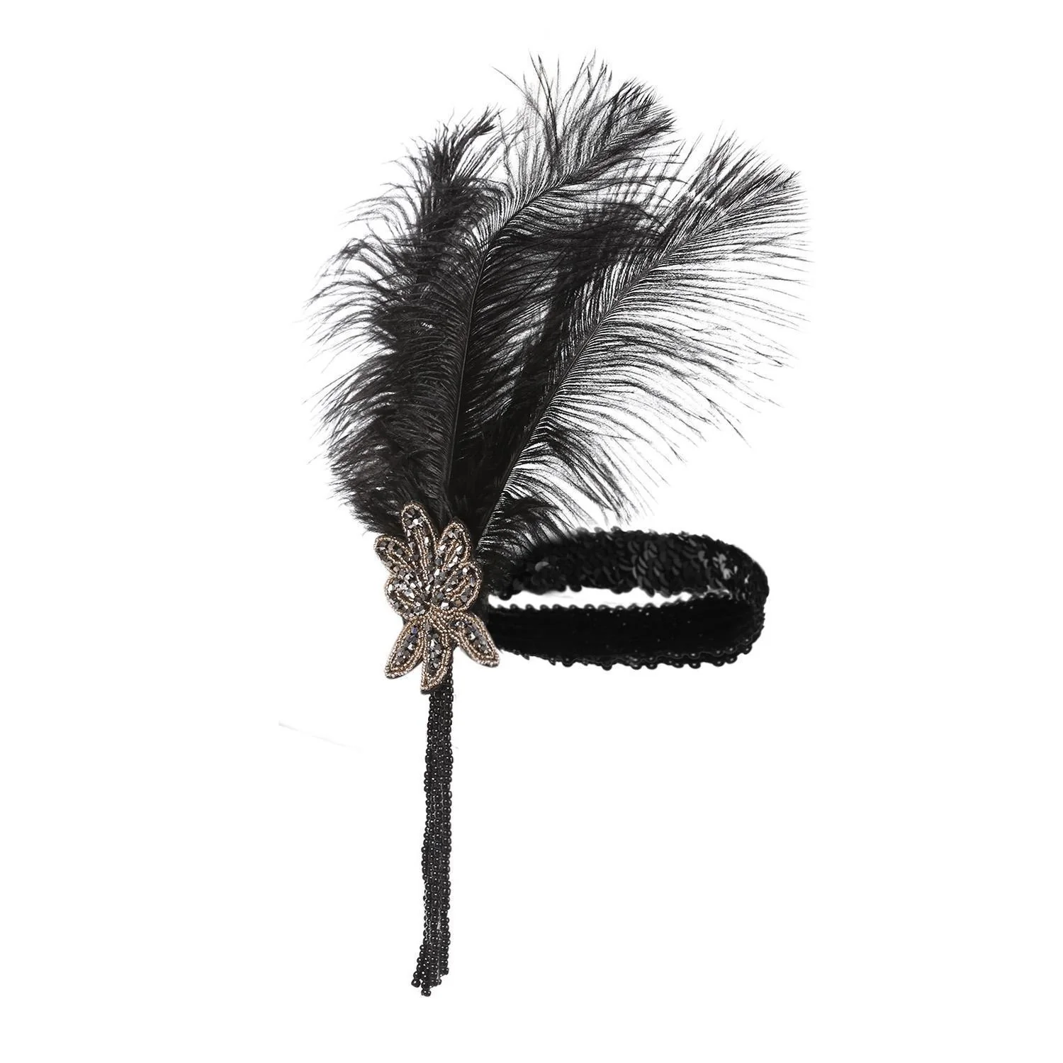 Costume Flapper avec serre-tĂȘte Ă paillettes de style 1920 avec plumes, collier Ă chaĂźne Flapper, 1 paire de gants noirs et porte-cigarette