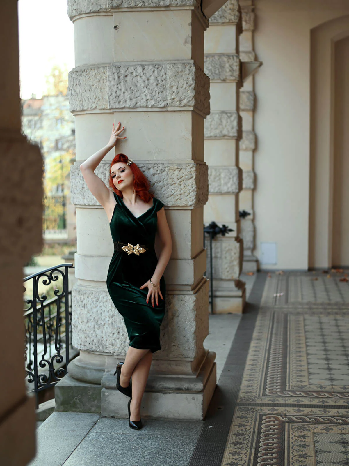 Robe Crayon Vintage Verte Année 60 Solide en Velours
