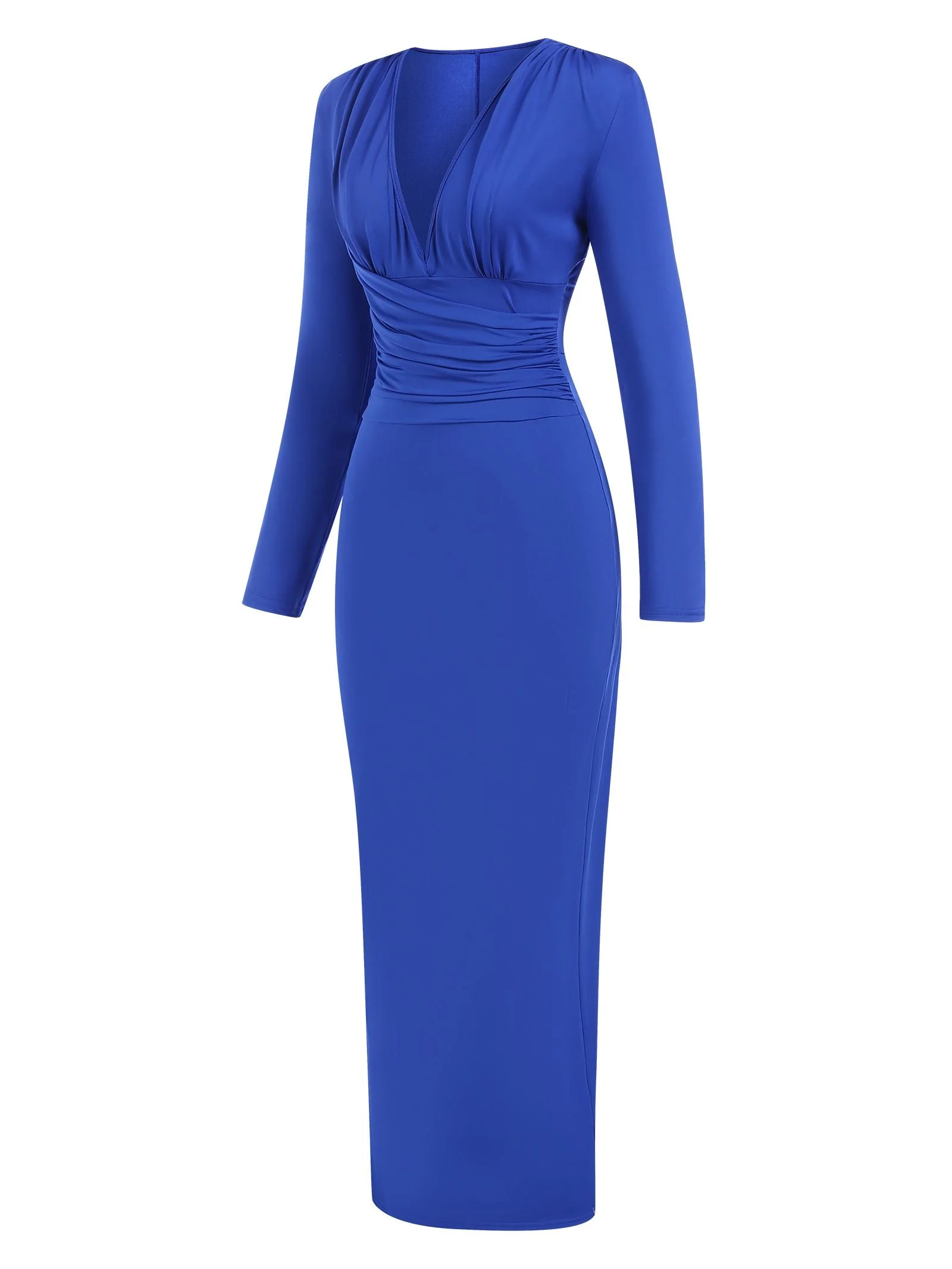 Robe moulante plissée unie à taille haute et col en V des années 1930