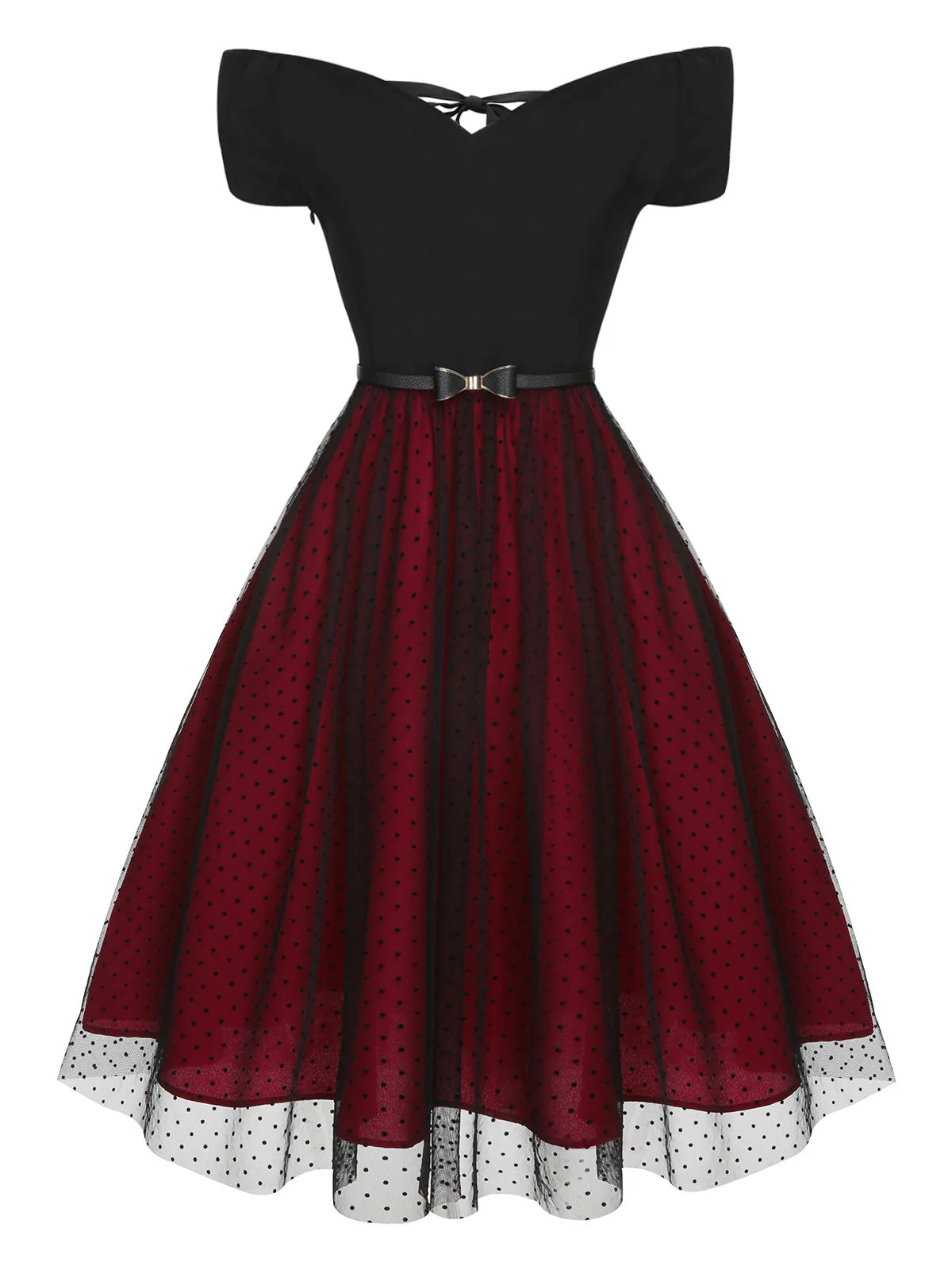 Robe rouge vin à épaules dénudées à pois des années 1950